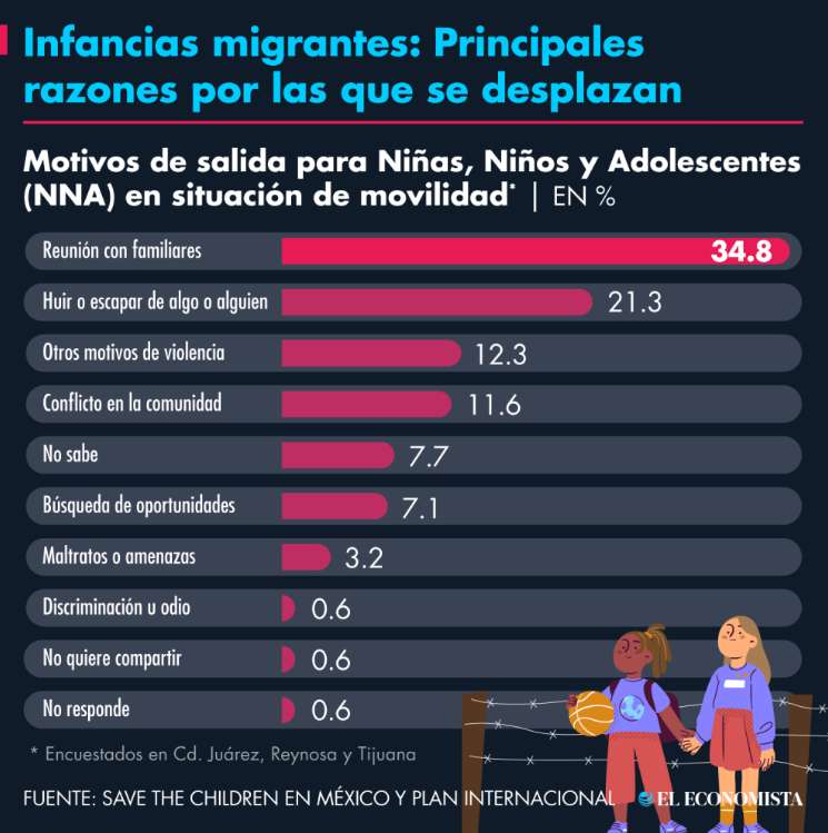 De acuerdo con el estudio ’Niñez no acompañada: riesgos y violencias en la ruta migratoria por México’ de la organización Save the Children, se observa también que 35 de cada 100 menores en situación de movilidad aseguran que están migrando para reunirse con sus familias.